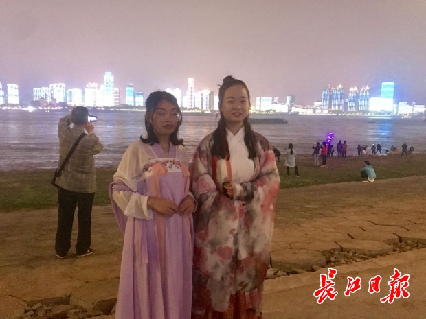 在武汉读高一的女生谢娟是和3个小伙伴一起过来的。她们穿着汉服在江滩上边看灯光秀边拍照。她说:“大家穿着汉服,以长江两岸灯光为背景拍照,特别有意义。”