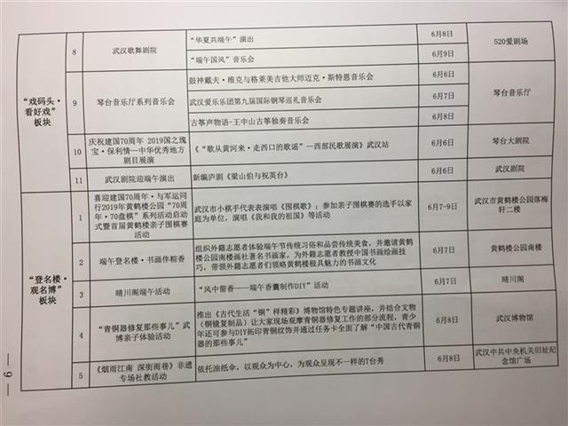 湖北日报讯(记者朱惠)今年端午节,相约来武汉享文旅盛宴吧。5月30日,武汉市文化和旅游局发布2019端午节文旅活动“菜单”,5大版块42项活动让这个端午节天天不重样。