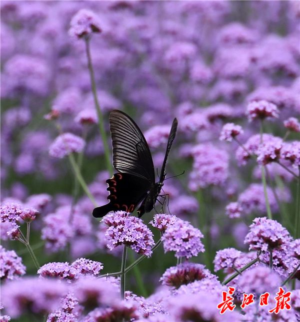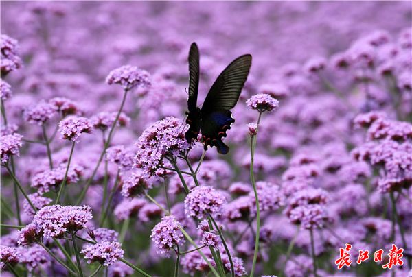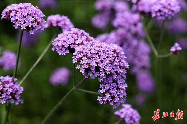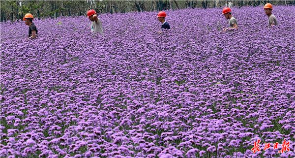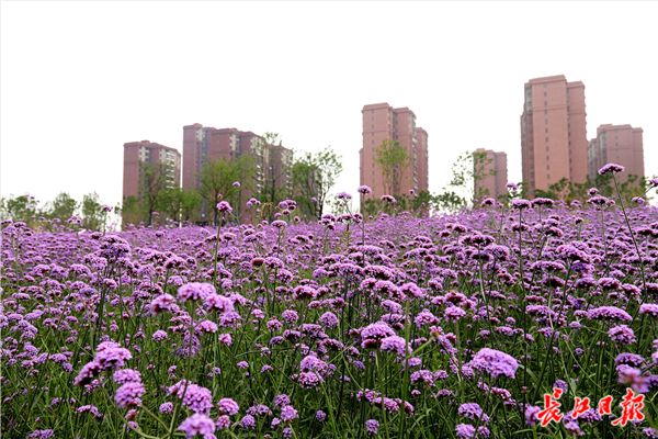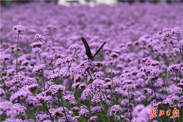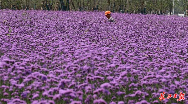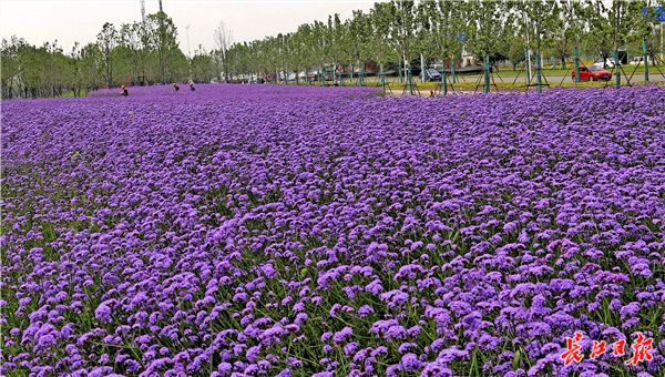 长江日报融媒体6月10日讯 2019年6月10日,东西湖临空港大道塔西路至径河路之间道路一侧的绿化带中,3000平方米的马鞭草盛开,紫色花海吸引不少市民的目光,据施工人员介绍,13公里长的临空港大道将种植数万平方米的马鞭草。