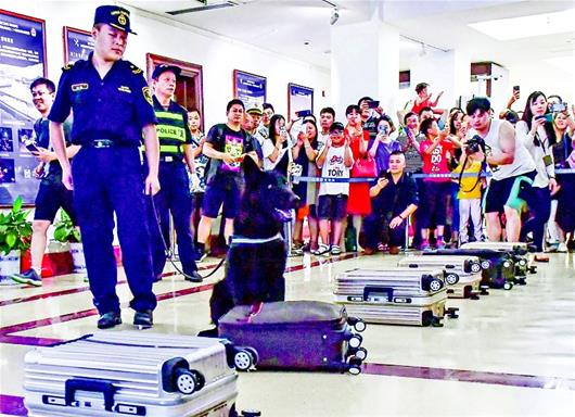 昨日,武汉海关开展宣传活动。3秒内,缉私犬格雷夫便轻松从10个行李箱中,找到了藏有海洛因的行李箱。 楚天都市报记者李辉摄