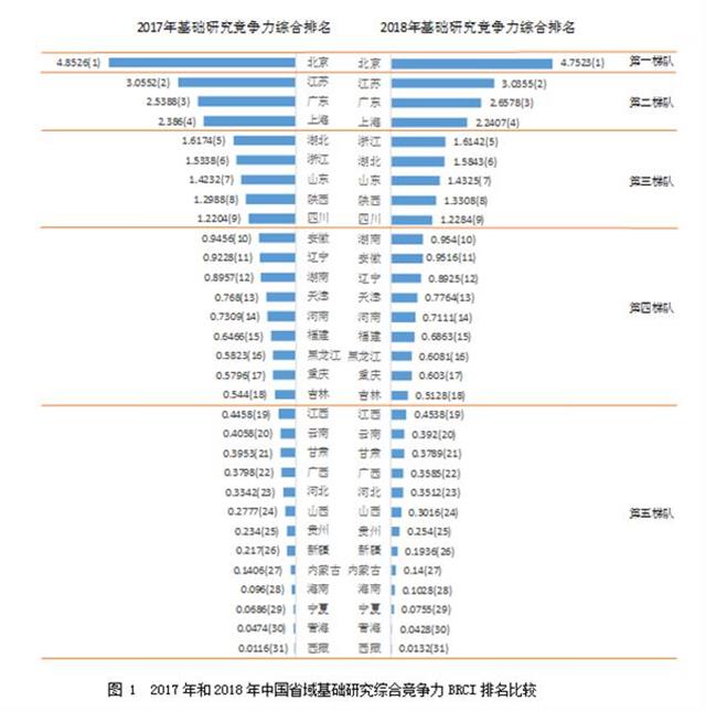 在中国省域基础研究竞争力排行榜上,北京遥遥领先,居第一梯队,江苏、广东和上海居第二梯队,分列二到四位,浙江、湖北、山东、、陕西、四川居第三梯队,分列五到九位。湖北继续领跑中西部省份,排名第六。