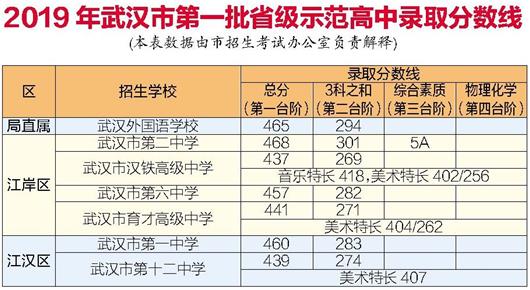 华师一附中录取线为488分,比去年高10分;武昌实验中学录取线为481分,比去年高18分;武汉外校录取线为465分,比去年高4分;武汉一中录取线为460分,比去年高7分。今年武汉中招采取按招生计划等额划线的办法,即按照招生计划1:1划线,计划招100人就划到100人。