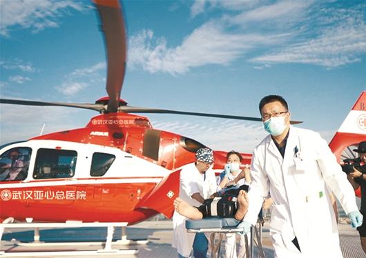 7月1日下午6时17分,一架标有“武汉亚心总医院”字样的橘红色医疗救援直升机降落在该院专用停机坪上。直升机内转运的是一名80岁的重度急性心梗患者,患者从180公里外的河南商城县飞到武汉接受紧急救治,回程仅用时62分钟。若由救护车陆地单程转运,至少需要4小时。经过及时救治,昨日患者已能自主进食。