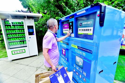 图为武汉洪山一小区内,居民用智能卡刷开垃圾箱,分类投放垃圾 楚天都市报记者李辉摄
