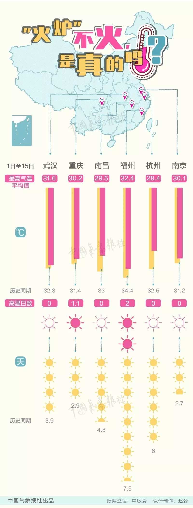 从气象观测资料来看,今年7月1日至7月15日,武汉、南昌、南京、杭州、重庆、福州等传统“高温城市”的平均气温和最高气温,均比往年偏低,高温日数也远远少于常年(1981年至2010年)同期。