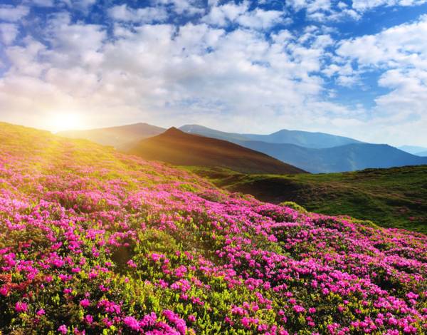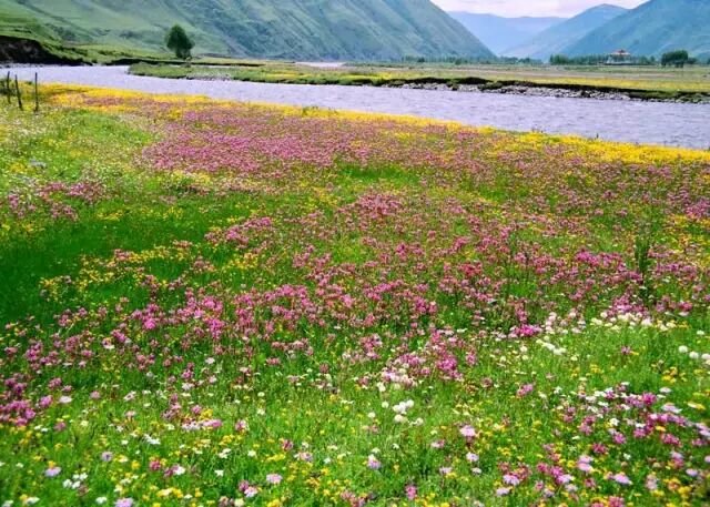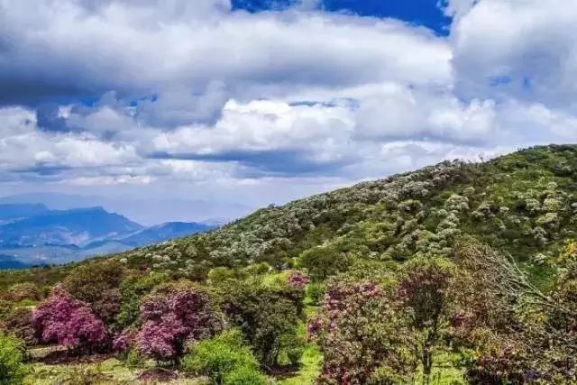 漫山遍野的杜鹃花点缀在一片绿色中,红的、白的、紫的,占据了从海拔2000米到4500米不同高度的坡地。