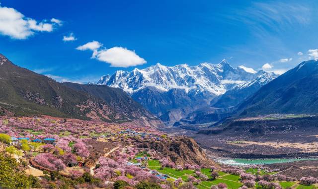 每年三四月,当粉色的桃花染遍林芝的山野,近处清澈透亮的溪流,远处矗立洁白的雪峰,森林、云海、蓝天、冰川、碧湖、雪山相映成趣,美成仙境。