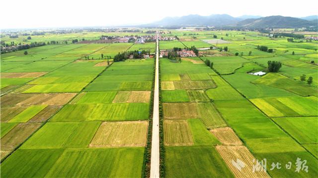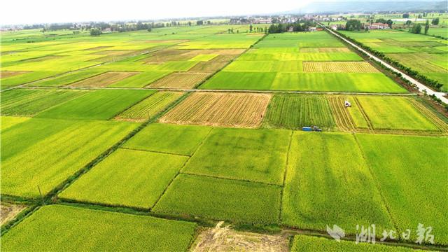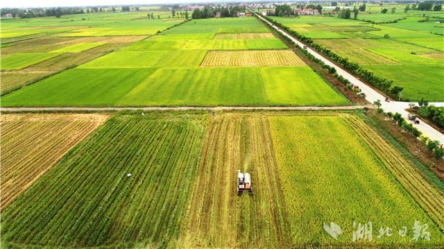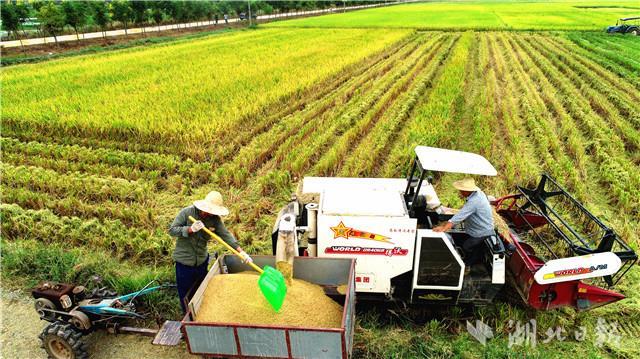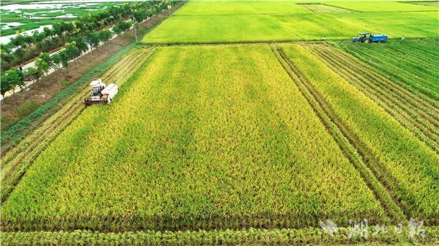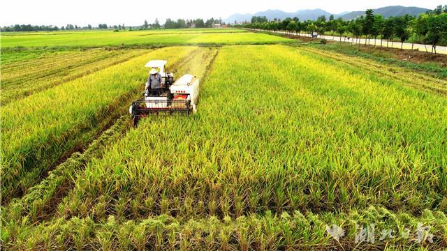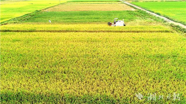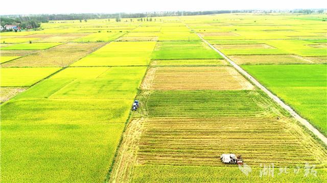 湖北日报讯(通讯员郑新涛)秋收时节,在宜城广阔田野上,处处可见谷粒饱满、谷穗低垂的水稻田,一台台收割机正在田间作业,一派丰收景象。据了解,该市今年水稻种植面积48万亩,预计总产33272万公斤,同比增长6%。这是9月17日航拍的小河镇石灰村农民收割的场景。