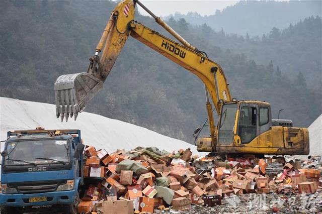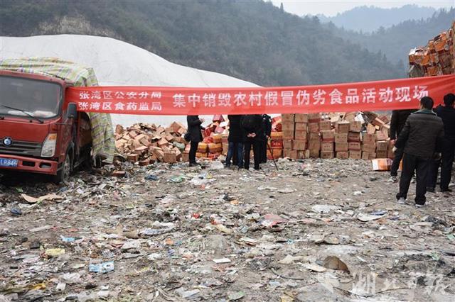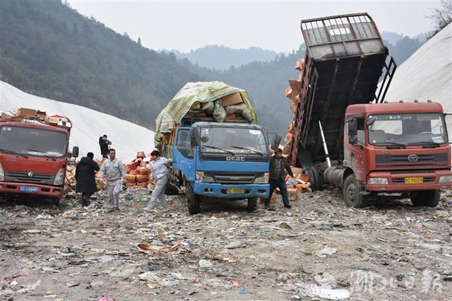 1月29日下午,在十堰市张湾区柏林镇陈坡村西部垃圾填埋场,整整6辆卡车的假冒伪劣产品被集中销毁,现场十分震撼。