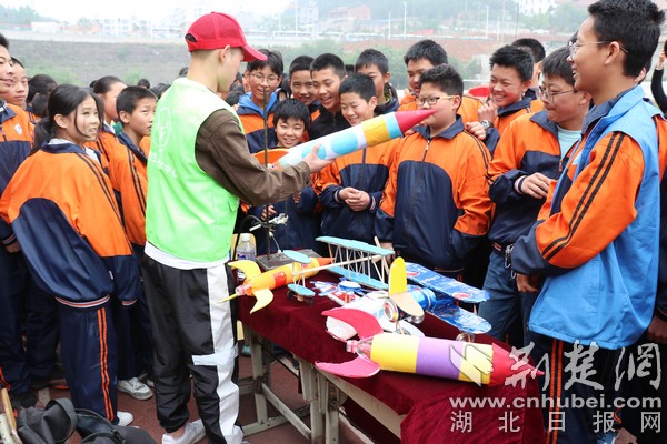 学生观看飞机、火箭模型。(通讯员 孙玉霞 摄)