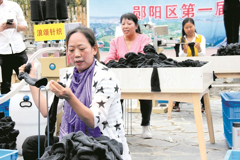 9月20日,以庆丰收“当好主人翁、建攻新时代”为主题的郧阳区第一届袜业技能竞赛在该区柳陂镇龙韵村举行。来自14家针织公司的28名精英选手参加本次比赛,此次竞赛主要包括缝头、翻袜两道工序。通过竞赛,旨在引导广大群众积极参与到袜业扶贫产业中,努力提高袜业编织技能,增加经济收入,助力脱贫致富。通讯员孟江摄
