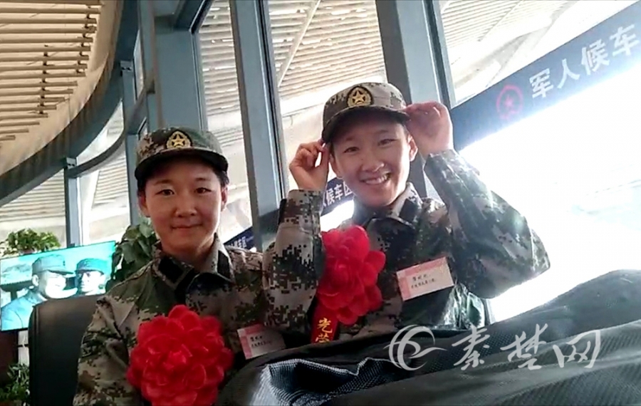 21日,汉江师范学院2017级学生黎明欣、黎明玥双胞胎姐妹办理完保留学籍等相关手续,身着戎装、胸带红花,在武汉集结后奔赴军营,开始新的军旅生活。 图/记者 张建波 特约记者 任自玲