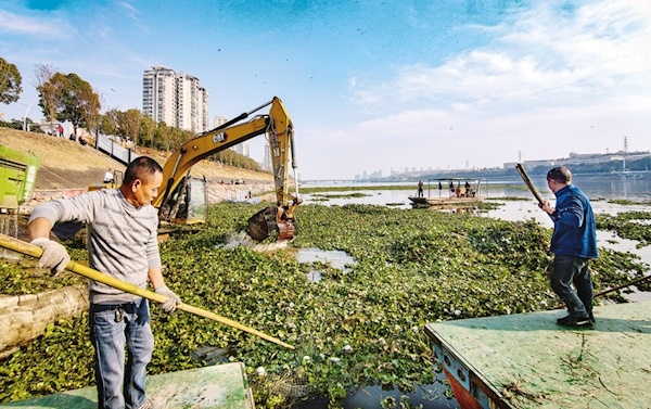 打捞白云湖水面水葫芦