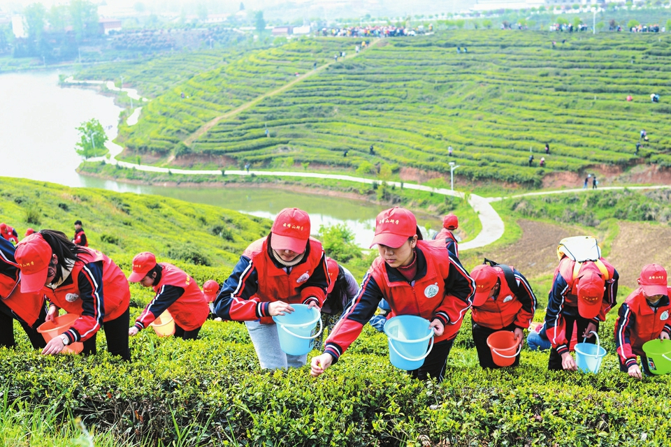 读万卷书,行万里路。近年来,我市研学旅游市场蓬勃发展。4月12日,武汉、广水、曾都区3个团队1200余名中小学生在我市茶园开展研学活动,亲身体验采茶过程,了解神农文化和茶文化等。(随州日报全媒体记者李文军摄)