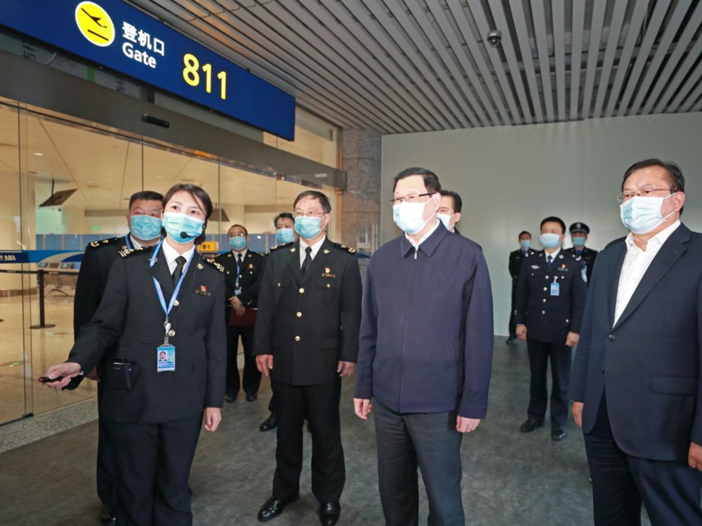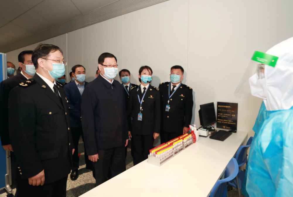 空港口岸是“外防输入”的第一道防线。应勇来到天河机场T3航站楼国际进港航班临时检验检疫区,实地了解入境人员检测、流行病学调查、应急处置流程等情况。