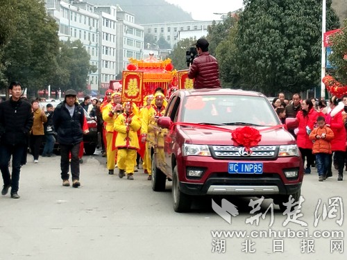 荆楚网客户端一荆楚网消息 (通讯员张云朝) 2月2日,农历腊月二十八,人们正在买卖年货,竹山县竹坪乡集镇上人山人海。正在叫买叫卖人们突然听到锣鼓喧天,乐声阵阵,看到一位如花似玉的姑娘坐着花轿,一位穿着古装长衫的帅哥,迈着惬意的步伐迎娶新娘。人们停止了买卖,追随着花轿看热闹,纷纷拿出手机拍照片、录视频,将这难得一见的富有创意的婚礼留下深刻的记忆。
