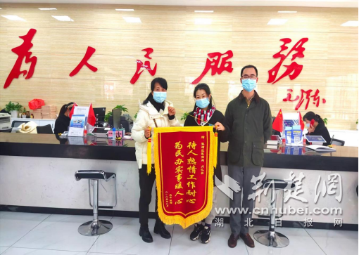 荆楚网(湖北日报网)讯(通讯员 尚长城、李亭亭)“你们的服务很耐心细致,解决了我的烦心事,真是太感谢你们了。”近日,赵女士来到十堰市张湾区政务服务中心,将一面写着“待人热情工作耐心,为民办实事暖人心”的锦旗送到了医保窗口,对工作人员尽职尽责、耐心细致的工作态度表示感谢。