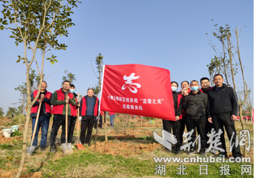 荆楚网(湖北日报网)讯(通讯员 齐斌、商忠健) 3月3日,十堰市郧阳区税务局“蓝萤之光”志愿服务队,走进茶店镇长岭村开展义务植树活动。志愿者们身着红马甲,挥锹培土,抬水浇灌,一排排桂花树迎风挺立,长岭村顿时春意盎然。