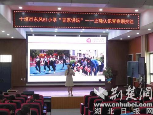 荆楚网(湖北日报网)讯(通讯员 荣彬)3月15日下午,十堰市东风61小学报告厅内气氛活跃、掌声不断。该校“百家讲坛”开讲。五年级100多名学生聆听了十堰市妇幼保健院心理健康专家韩娟老师有关青春期心理健康教育的讲座。