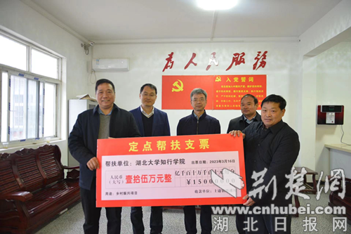 荆楚网(湖北日报网)讯(通讯员 许海涛、熊万斌、陶承发)3月16日,湖北大学知行学院党委书记彭德忠一行将15万元乡村振兴资金和粮油及物资送到十堰市竹山县上庸镇磨滩村。该县副县长刘洋、县教育局长罗淳及上庸镇相关干部参加捐赠仪式。