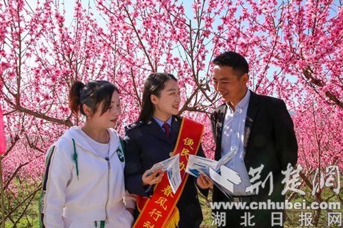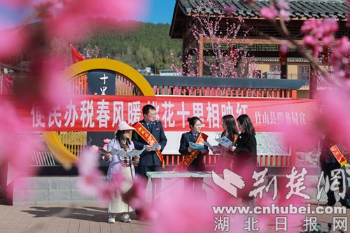荆楚网(湖北日报网)讯(通讯员 黎正琴、薛羽、肖绍鸿)桃之夭夭,灼灼其华。近日,十堰市竹山县宝丰镇公平村第三届桃花节隆重开幕,漫山遍野的桃花竞相绽放,美不胜收。竹山县税务局结合第32个“税收宣传月”,组织税惠宣传服务队走进老官寨的百亩桃园,以花为媒开展系列税费宣传活动,在连绵的“桃花红”中增添了一抹别样的“税务蓝”。