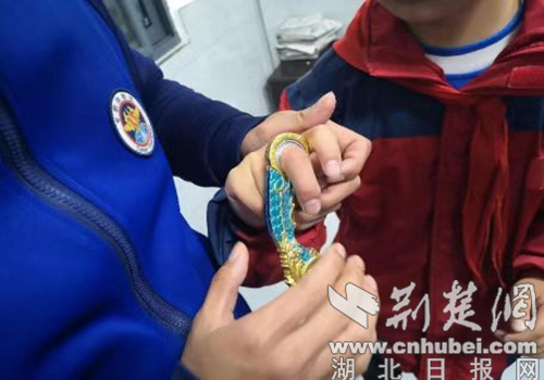 经过30余分钟紧张救援,最终成功将卡在手指上的玩具匕首取下,所幸手指只是有些红肿,并无大碍。