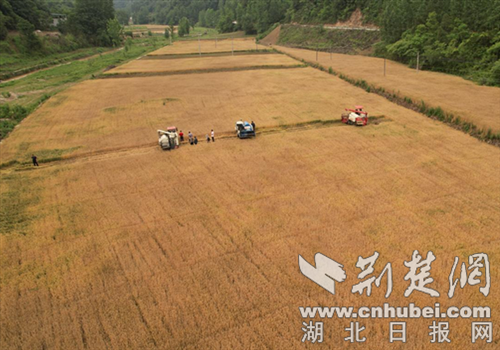 荆楚网(湖北日报网)讯(通讯员 邹景根)喜看麦田千重浪,荆楚大地好丰光。又是一年麦收时,湖北省郧西县的小麦又迎来丰收季。散布在山间的一块块麦田,麦浪滚滚,麦香扑鼻。随着收割机驶过,一颗颗饱满的麦粒装袋入库,处处洋溢着丰收的喜悦。