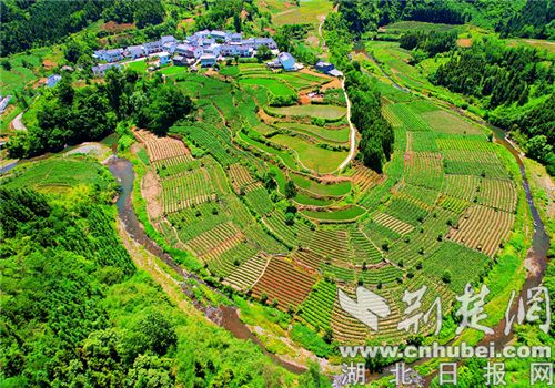 荆楚网(湖北日报网)讯(通讯员向继华、袁帅摄)芳菲六月,十堰市竹山县大庙乡马河村,绿意盎然。航拍视角下,线条分明的茶园与田块道路、农房、树林等交相辉映,犹如一圈圈“大地指纹”,展现出勃勃生机。