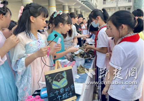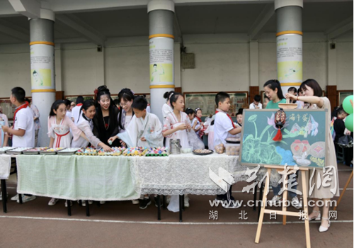 荆楚网(湖北日报网)讯(通讯员 陈梦园、朱惟佳)6月14日下午,十堰市实验小学五年级600余名师生参与,2000余名学生观摩了“仲夏赋雅趣 粽香端午情”主题活动,旨在激励学生了解中国传统节日端午节的来源、习俗、意义和价值,传承中华传统文化,培养学生劳动意识和能力,提升学生文化内涵,落实学校“立德树人”根本任务。茅箭区教育局教育股王俊棋、茅箭区“中华传统文化德育协作体”成员学校21名教师代表受邀参加本次活动。
