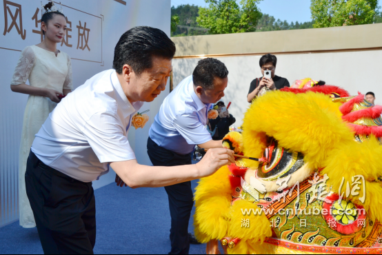 在热烈的掌声下,雄狮登场,共贺盛事。湖北寿康永乐商贸集团有限公司党委书记、董事长、总裁王国华为祥狮执笔点睛,金笔落墨、雄狮起舞,五彩礼花翩然而落,华悦府营销中心褪去神秘面纱,正式对外开放。