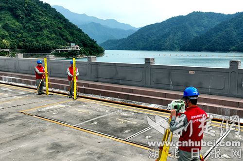 黄龙滩电厂水工分场党支部党员在坝顶开展大坝沉陷变形观测作业。 涂坦 摄