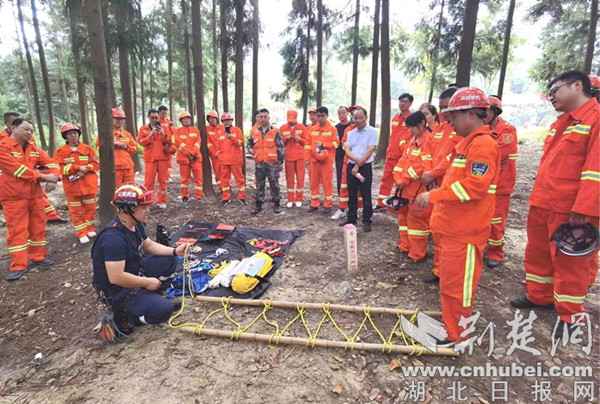 当天上午,参赛队员集中接受了森林火灾灭火业务理论知识辅导,邀请了十堰山盟救援队救援专家为队员授课,现场进行野外搜救、结绳、简易担架制作等技能培训。