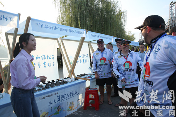 在“竹山绿松石杯”2023 中国国际舟钓锦标赛开幕式现场的展区内,精美的绿松石挂件、摆件、手链等,让国内外的精英钓手们爱不释手。