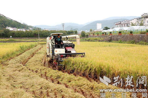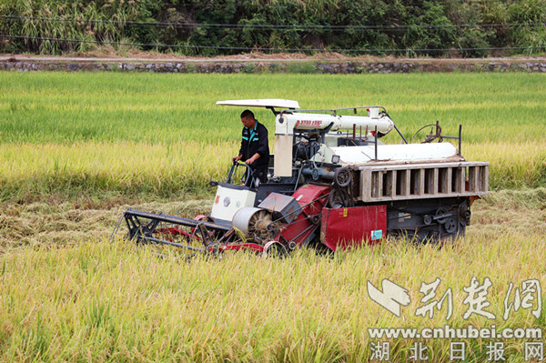 荆楚网(湖北日报网)讯(通讯员 王驾驭)又是一年丰收季,风吹稻浪稻穗香。9月19日,十堰市竹山县擂鼓镇护驾村省级农作物新品种展示示范评价基地水稻正在收割,收割机在整齐的稻田里来回穿梭,留下一条条整齐的行道,金黄的水稻被收割机吞进“肚子”,伴随轰隆声,水稻的梗和叶子被粉碎,均匀的铺在田地里。两个来回过后,收割机便满载而归,在路旁等待的运谷车从出粮口接过稻谷,金灿灿的谷粒垒成了小山。