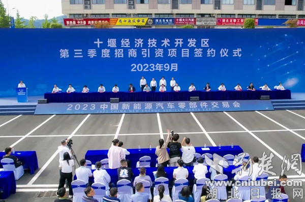 荆楚网(湖北日报网)讯(通讯员 刘爱理)9月22日,十堰经开区借助首届全球汽车新生态发展大会暨2023中国新能源汽车零部件交易会(简称“交易会”)的东风,隆重举行十堰经开区第三季度招商引资项目集中签约仪式,30个招商引资项目、15个校区合作成果转化项目集中签约,协议总投资176.8亿元。十堰经开区党工委副书记、管委会副主任明怀宇主持,区党工委、管委会班子成员出席签约仪式,重点项目签约代表、参展企业代表,经开区规上企业代表,全区各机关事业单位干部共同见证十堰经开区的项目签约。