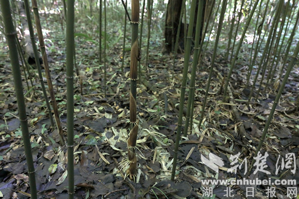 荆楚网(湖北日报网)讯(通讯员 程平、王金、黄弘)10月8日,笔者在竹山县官渡镇武陵峡西沟口、石灰窑、一线天、小龙湾看到,成块竹林枝繁叶茂,竹笋在雨水的滋润下拔地而发,嫩笋随处可见。当地村民把这种竹子叫刺竹,一年可以两季生笋,天然分布面积约20余亩。