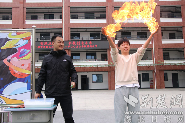 活动现场,孩子们自制的树叶画、升降旗台、不倒翁、风车、立体科技画等科技作品引人注目,创意奇特。科学老师的“掌中火”实验、干冰表演,五、六年级学生的叠叠乐科技表演和二年级学生的纸飞机放飞仪式更是将此次活动推向了高潮。现场的小观众们要么细心观察、认真记录,要么动手操作,要么亲身体验,处处享受着科技带来的魔力和快乐。