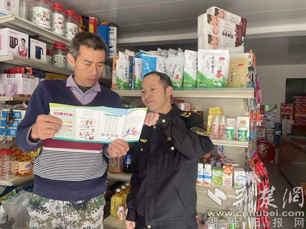荆楚网(湖北日报网)讯(通讯员 程丽)“如果发现有人向你们推销非法出版物,请第一时间向我们反映。”11月16日,在十堰市郧西县槐树林特场中心集镇的小商店内,该场市场监管所负责人刘海军,向商家发放“扫黄打非”折页纸时嘱咐道。