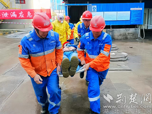 险情就是命令。该企业在上报市生态环境局郧阳分局的同时,立即组织有关人员50余人,组成现场警戒组、伤员救护组、泄露处理组、事故调查组,开展现场处置。泄露处理组两名维修人员闻令而动,穿戴防毒面具,深入实地查看处理氨水管道泄露点,立即停止氨水卸车,关闭阀门。此时,该巡检人员在现场处理过程中因氨气中毒“晕倒”。伤员救护组迅速将“晕倒”人员用担架转移至上风向新鲜空气处进行急救。