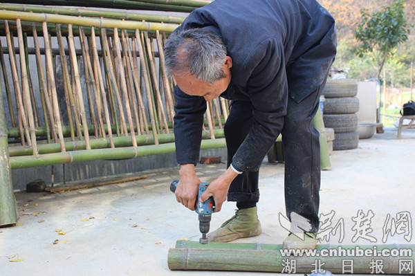 枧槽村村民万正兴给竹子打孔制作竹篱笆。 通讯员供图