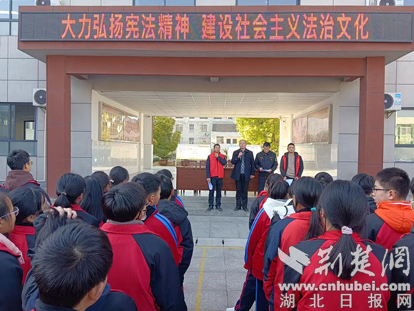 荆楚网(湖北日报网)讯(通讯员 段定、张斌)为进一步增强学生对宪法知识的理解,普及宪法知识,推动宪法教育进校园,营造尊崇宪法、学习宪法、遵守宪法、维护宪法、运用宪法的氛围。12月4日上午,第十个“国家宪法日”来临之际,十堰市房县白鹤镇组织镇司法所、派出所、市场监督管理所和志愿者走进全镇各中小学,围绕“大力弘扬宪法精神,建设社会主义法治文化”主题,开展宪法宣传进校园活动。