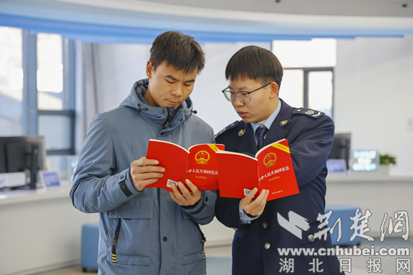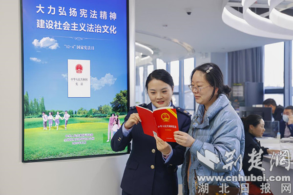 荆楚网(湖北日报网)讯(通讯员 薛羽、张雅雯)“原来宪法离我们这么近!”在十堰市竹山县政务中心三楼大厅税务专区,一块块展播屏中滚动播放着宪法宣传海报,吸引了往来纳税人缴费人的目光。