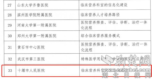 荆楚网(湖北日报网)讯(通讯员 马婷婷)12月20日,国家卫生健康委医院管理研究所公布第二批临床营养科建设示范单位名单,湖北省共有4家医疗机构入选,十堰市人民医院是全市唯一入选医院,也是全省唯一以“临床营养科室的信息化建设”为建设方向的医院。