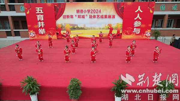 荆楚网(湖北日报网)讯(通讯员 李华英) 12月28日下午,十堰市郧西县城关镇明德小学举行了一场别开生面的明德小学2024迎新年“双减”暨体艺成果展演活动,本次活动旨在展示学校在“双减”政策下取得的丰硕成果,同时为迎接新年的到来,营造欢乐祥和的节日氛围。