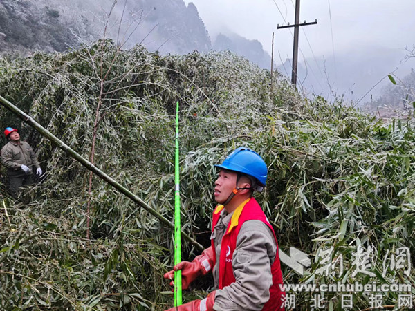 荆楚网(湖北日报网)讯(通讯员 但兴竹、储召清)1月16日夜晚,十堰竹山县柳林乡出现雨雪冰冻天气,高山地段覆冰极为严重,数公里道路两旁直径达到二十多公分的树木都不堪覆冰重力压倒在路中间,涉及民生的电力系统遭受严峻考验。10千伏洪76墨池线跳闸。国网竹山县供电公司迅速组织人员迎风冒雪,火速赶往供电辖区巡视线路排查故障隐患,抢修保电。