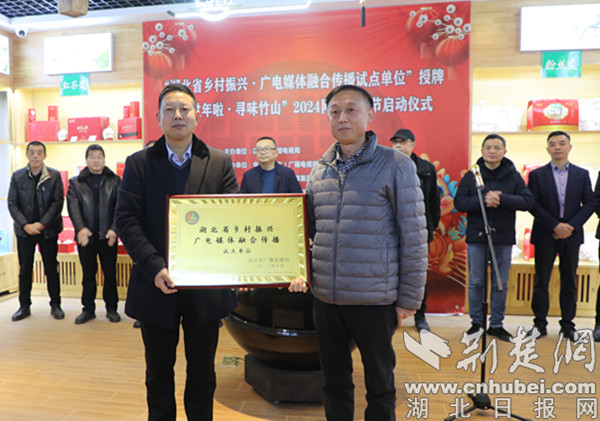 荆楚网(湖北日报网)讯(通讯员 但兴竹、章鹏)1月18日,“湖北省乡村振兴·广电媒体融合传播试点单位”授牌暨“过年啦·寻味竹山”2024网络年货节启动仪式在竹山县融媒体中心举行。湖北省广播电视局媒体融合发展处处长舒欣,湖北长江垄上传媒集团有限公司副总经理杨斌,中国(湖北)广播电视媒体融合发展创新中心正高级工程师、专班负责人李显辉,县委常委、宣传部长任卓,各县市区融媒体中心代表、县直有关部门和企业代表参加活动。