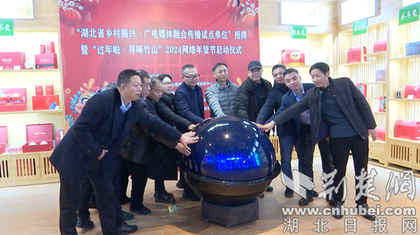 启动仪式上,省广播电视局媒体融合发展处处长舒欣为竹山县融媒体中心“湖北省乡村振兴·广电媒体融合传播试点单位”授牌,县委常委、宣传部长任卓致辞,参与活动领导触摸启动球,启动“过年啦·寻味竹山”2024网络年货节。