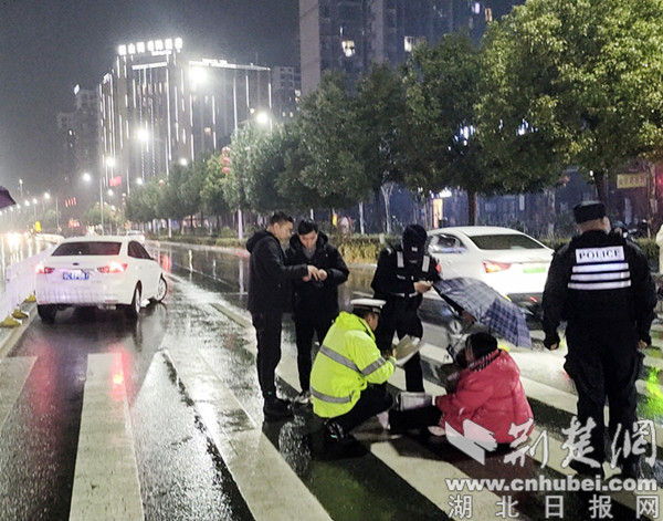 1月18日晚,因雨雪天气路况、视野不好,一辆小车在经过郧阳区新天地斑马线时,倒车镜将一名抱小孩儿正在过马路的妇女撞倒,正在附近巡逻的郧阳区反恐大队民警看到后,立即拨打120,并在其身旁为其撑伞等待至120救护车到来,一起合力将其送上救护车。