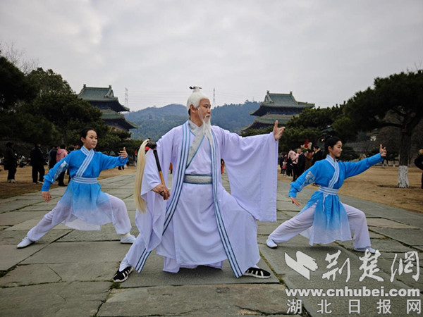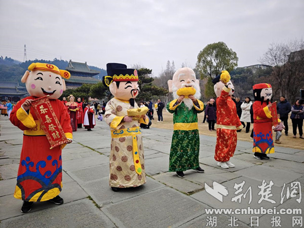 身穿古装Cosplay“福禄寿喜财”的五福送吉祥、四海龙王送福、张三丰、榔梅呈瑞情景剧、传奇•太极武当演员巡演,将武当文化、传统习俗与青年群体喜闻乐见的COS文化相结合,吸引过往群众和游客驻足观看,现场掌声不断。