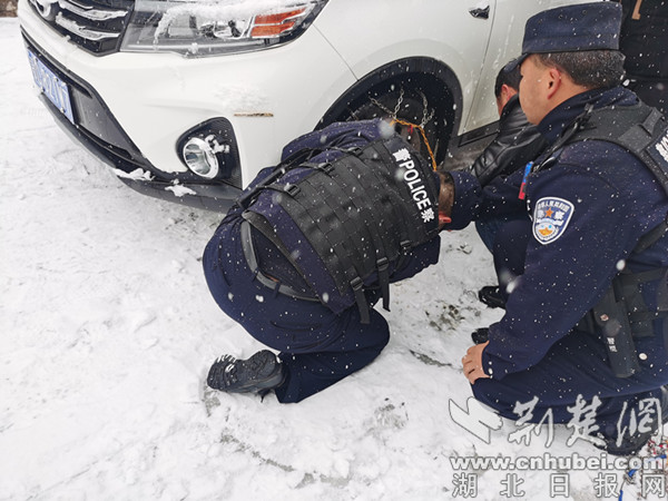 “师傅,去哪儿啊,下这么大的雪!”下午3时20分许,民警杨照意、张秉珅在路口及时拦停一辆轿车。“家里有点急事!我父亲生病了,我要回去看一下!”原来是辖区村民彭先生突然接到了父亲病重的消息,正冒雪驾车着急往老家赶。鉴于实际情况,两人叮嘱他注意行车安全事后放其通行。车刚开出不久,便因车轮打滑困在了弯道处。“车上带有防滑链没?”民警赶忙上前帮其停稳车,迅速帮他安装了防滑链。“幸亏遇到你们,太感谢了!”彭先生脱困后连连向民警道谢。